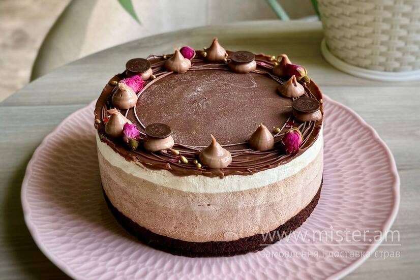 Шоколадний бісквіт, вершковий мус із білим, молочним та чорним шоколадом.