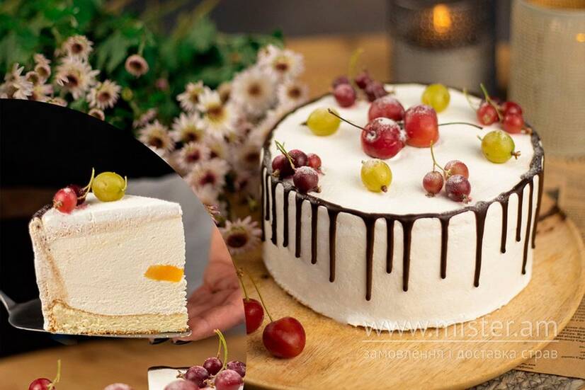 Тонкий ніжний бісквіт, сирне суфле зі шматочками фруктів (ківі, персик). Декорований сезонними фруктами.