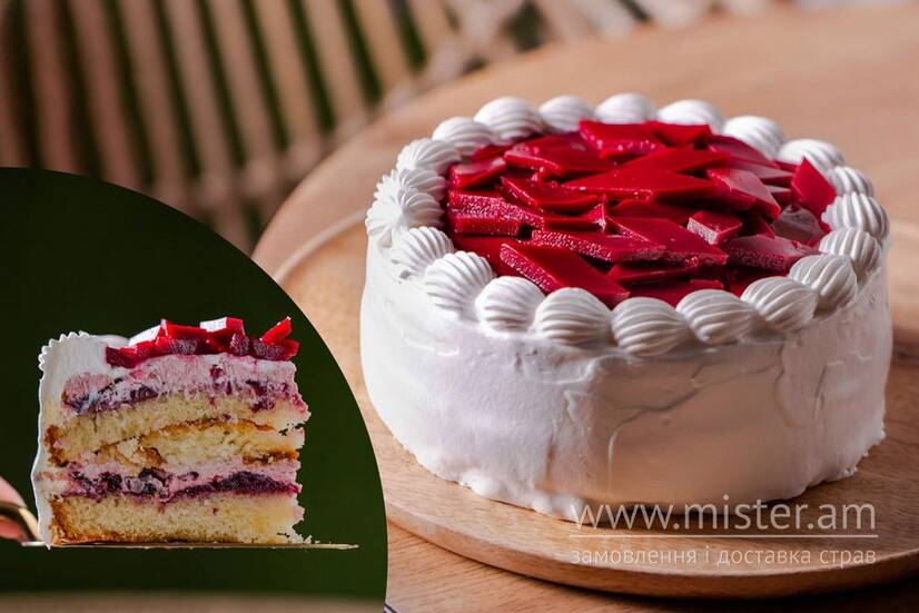 Ніжний білий бісквіт, просочений ароматним сиропом, вишневий крем на основі сиру Маскарпоне, прошарок з натурального вишневого мармеладу.
