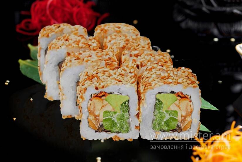 Вугор, авокадо, огірок, японський майонез, соус Унагі, кунжут, рис, норі.