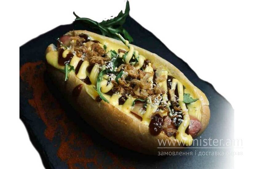 Булочка, сосиска, сир, помідор, огірок маринований, соус грибний, соус сирний, соус барбекю.