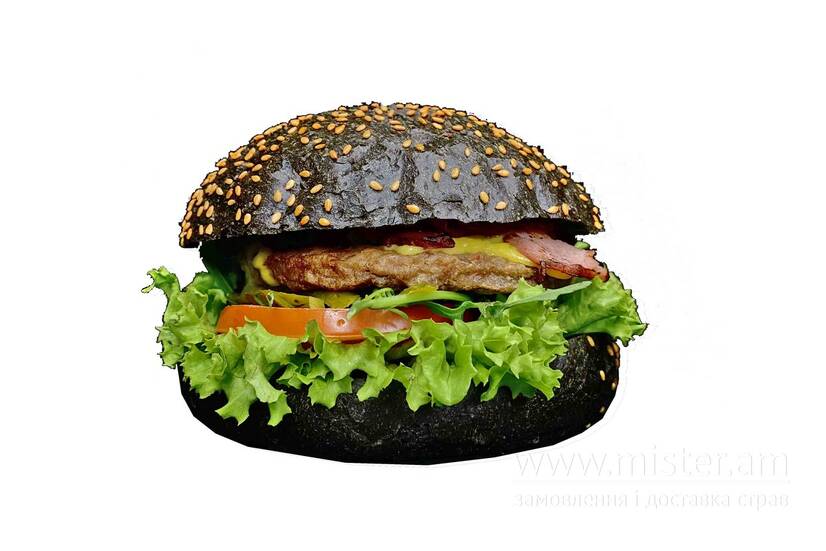 Котлета яловича, бекон, сир тостовий, лист салату, рукола, помідор, огірок маринований, цибуля синя, булочка, кетчуп, соус барбекю, картопля фрі.