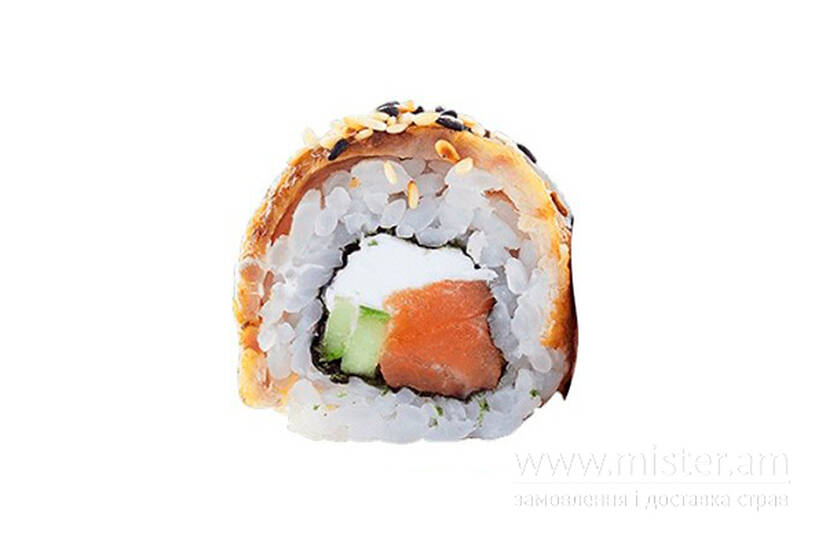 Сир, лосось, вугор, огірок, кунжут, соус Унагі, рис, норі.