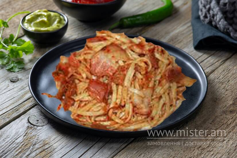 Локшина яєчна, бекон, курка, спаржева квасоля, морква, перець солодкий, соус барбекю.