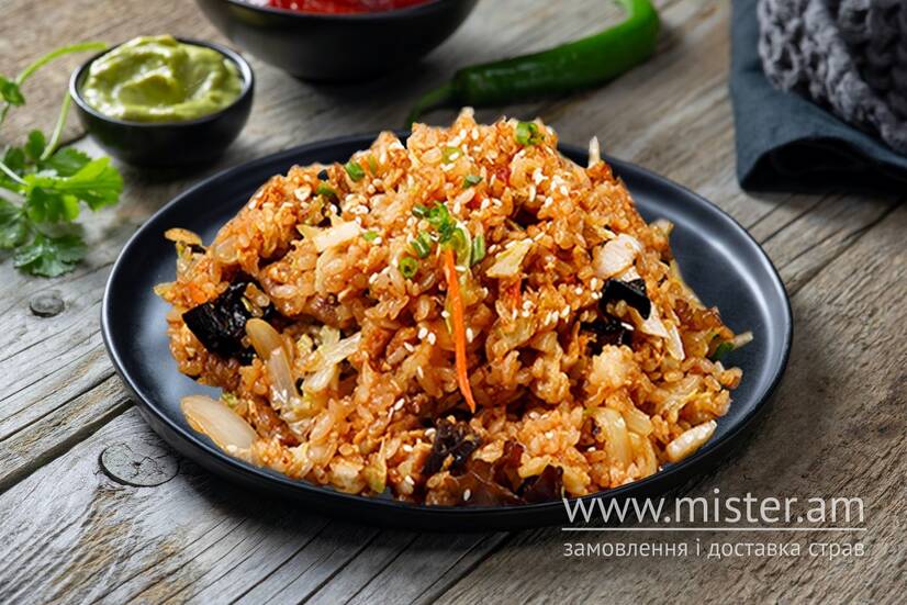 Рис, яйце, кукурудза, морква, перець солодкий, соус.