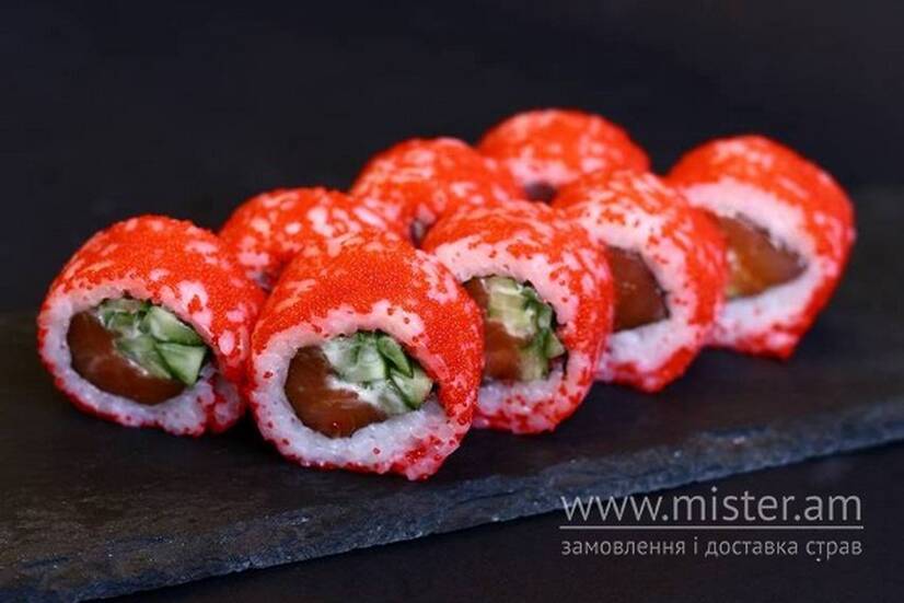 Норі, рис, ікра масаго, сурімі, огірок, японський майонез.