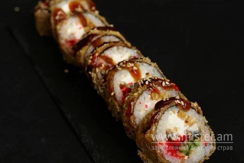 Норі, рис, крем-сир, вугор, омлет тамаго, ікра масаго, авокадо, соус унагі, кунжут (кляр, панко).