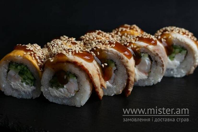 Норі, рис, крем-сир, тигрова креветка, вугор, чедер, соусунагі, кунжут.