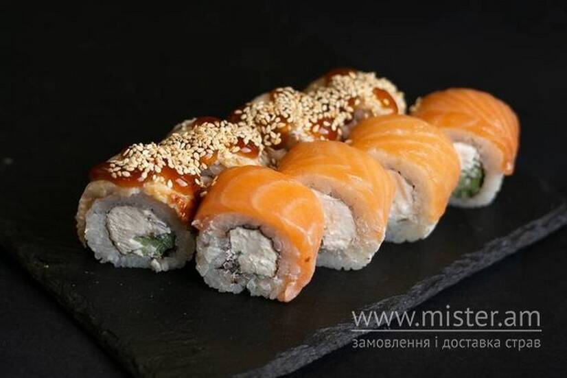 Рис, норі, крем-сир, огірок, лосось, вугор, кунжут, соус унагі.