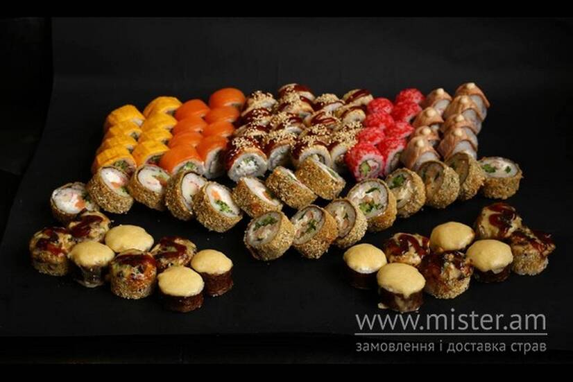 Філадельфія з лососем, Філадельфія з вугрем, Каліфорнія в ікрі з сурімі, Каліфорнія в кунжуті з вугрем, Ханамі, запечений з тигровою креветкою, Хіросіма, темпура тонкацу, темпура чікен, Сакура.