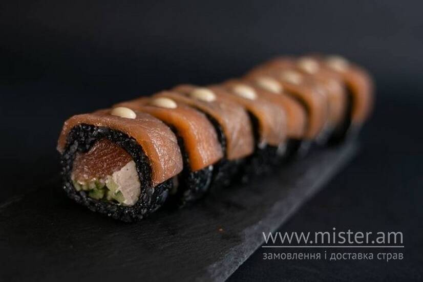 Норі, рис, чорнила каракатиці, крем-сир, огірок, лосось, японський майонез.