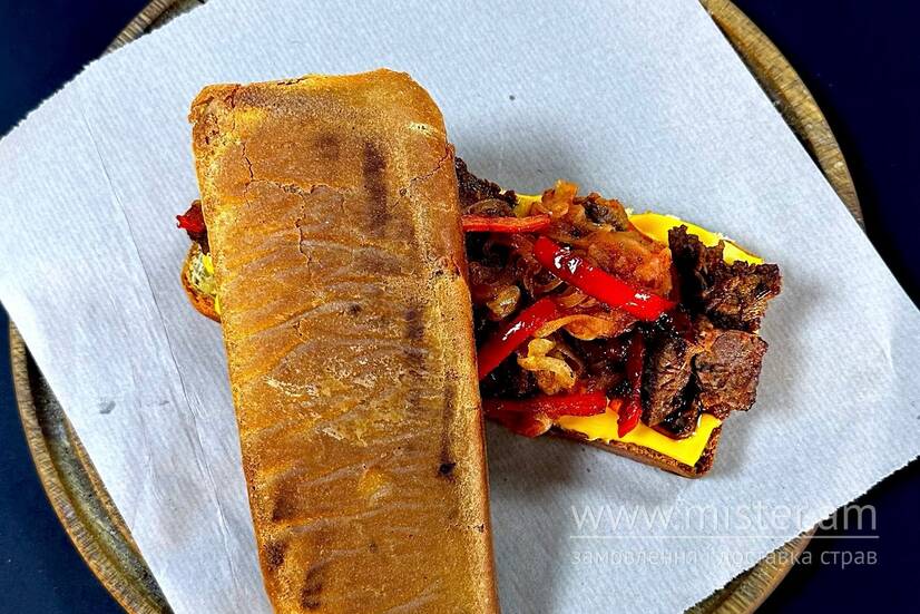 Булочка бріош, соус айолі, сир чеддер, огірок маринований, цибуля, перець болгарський, ростбіф.