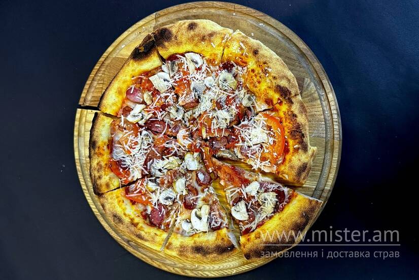 Соус, сир моцарела, печериці, помідор, мисливські ковбаски, сир пармезан.
