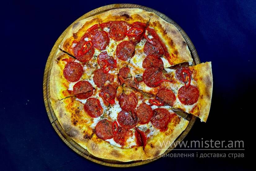 Соус, сир моцарела, папероні, перець чілі, орегано.