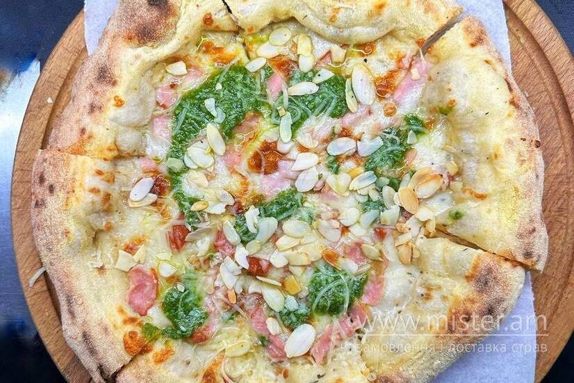 Вершковий соус, сир моцарела, філе, шинка, пармезан, песто, мигдалеві пластівці.
