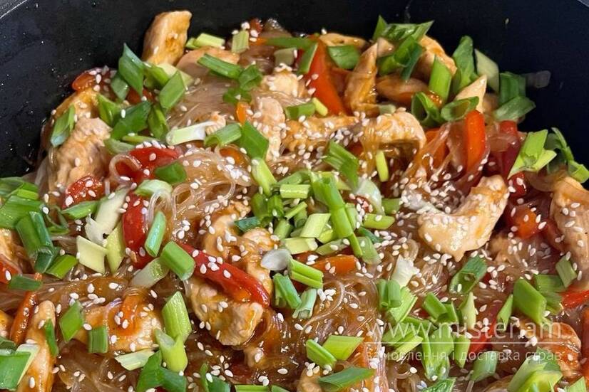 Фунчоза, куряче філе, перець болгарський, спаржа, цибуля, морква, гриби шампіньйони, бульйон, соус wok, зелена цибуля, кунжут, кунжутна олія.