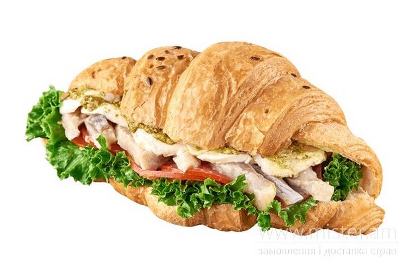 Круасан, оселедець, сир Моцарела, помідор, салат, соус Песто, соус Часниковий.