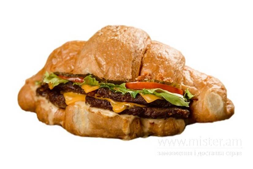 Круасан, яловича котлета, сир тостовий, салат Айсберг, помідор, квашений огірок, цибуля сушена, соус Бургерний.