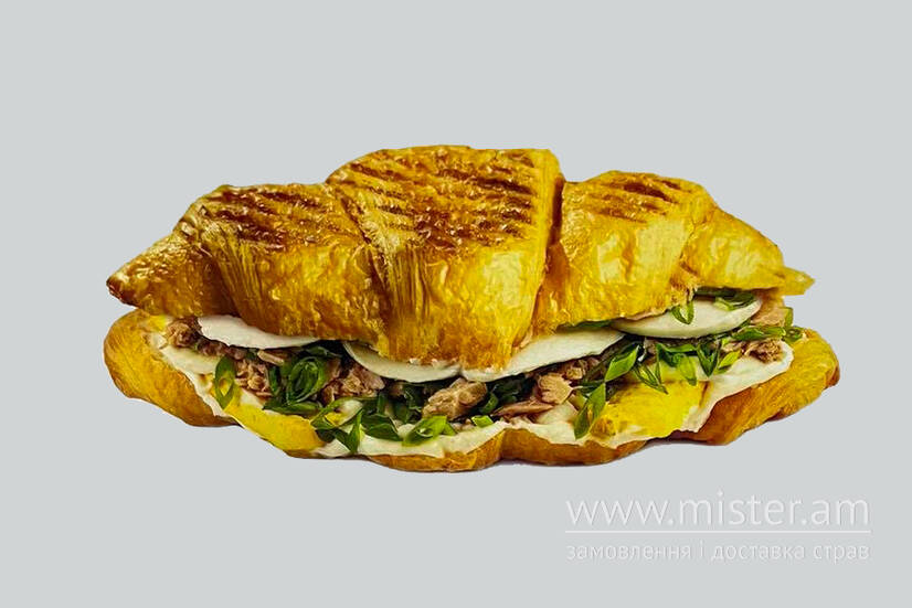 Круасан, тунець, сир Моцарела, яєчня, зелена цибуля, соус Класичний.