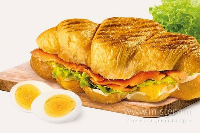 Круасан, лосось, салат Айсберг, яєчня, соус Класичний.