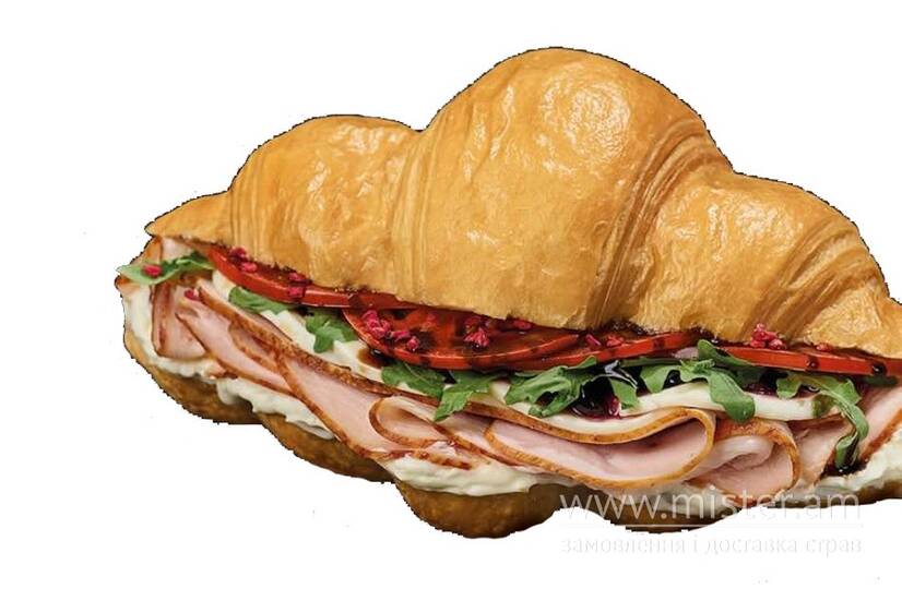 Круасан, індичка, сир Моцарела, рукола, смородина перетерта з цукром, крем-сир, бальзамічний крем, помідор, сублімована малина.