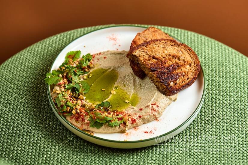 Кремова закуска із запеченого баклажана, часнику та лимону. Легка димність і шовковиста текстура. Подаємо з крафтовим хлібом.