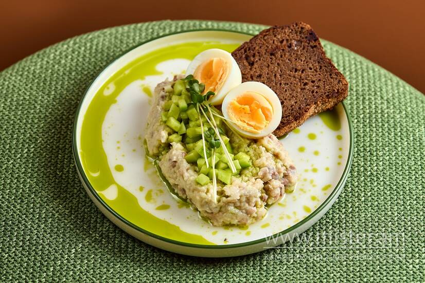 Класичний форшмак у новому прочитанні — ніжна оселедцева паста з вершковими нотами, доповнена свіжим огірковим тартаром, подаємо з крафтовим хлібом.