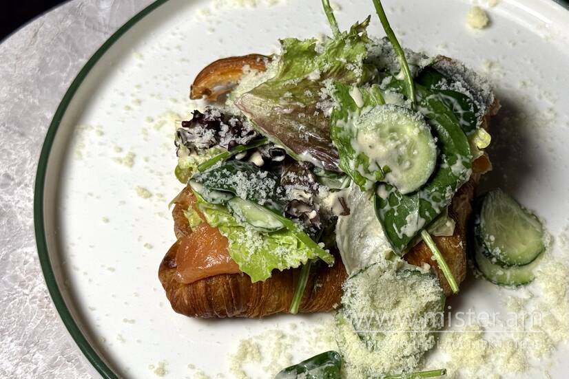 Підсмажений круасан на грилі, мажемо гуакамоле (авокадо, вершкое масло, кінза, петрушка, цибуля зелена, томати, цедра лайму), кладемо лосось гравлакс з джином та апельсиновим фрешем, і накриваємо міксом салату з додаванням огірка та японського соусу, посипаємо пармезаном.