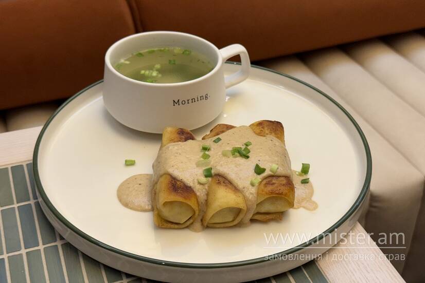 Млинці, пармезановий соус та гарячий курячий бульйон.