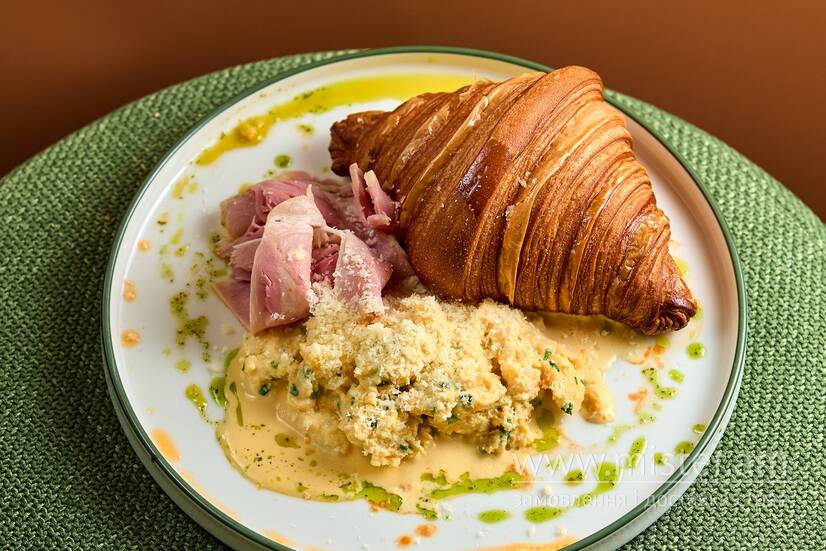 Ніжний французький круасан або ароматний Бріош на твій вибір з повітряним скремблом, ніжне прошутто Котто та щедра порція соусу Чедр.