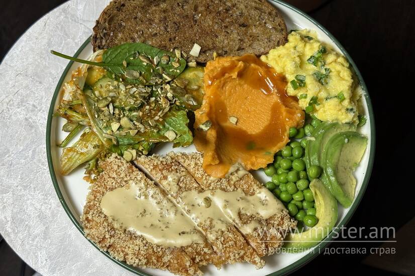 Куряче філе паніроване в сухарях панко, японський майонез, мікс салату з огірком і томатним дресінгом, яйця на вибір (скрембл, 6-хв яйце, сонячне око, омлет), взбитий йогурт, пюре батату, азійский соус, зелена цибуля, гречаний хліб, авокадо з зеленим горошком.