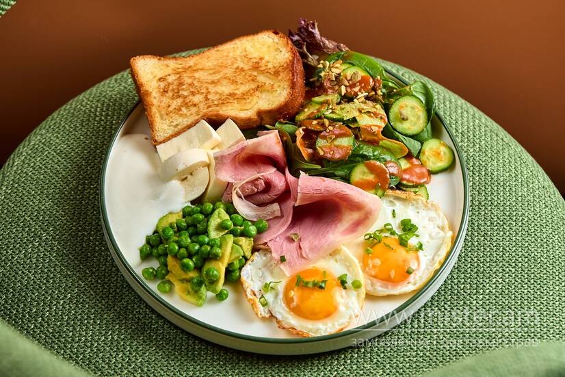 Щедра тарілка ранкового задоволення: прошутто Кото, свіжий салат, яйце за вашим смаком, кремовий йогурт, авокадо з ніжним зеленим горошком і ароматний бріош та вершкова моцарелла.