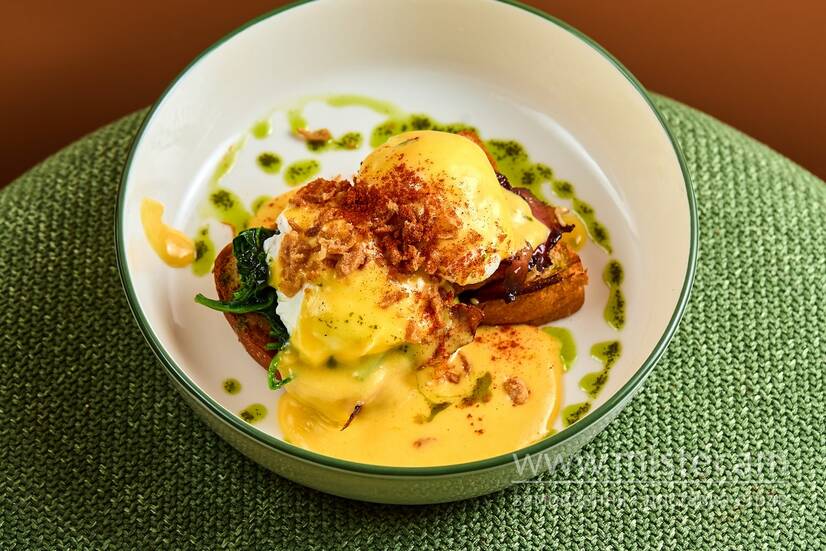 Класика, що ніколи не набридає: ніжне яйце пашот на подушці з домашнього бріошу, хрусткий бекон і щедра порція соусу Голландез.