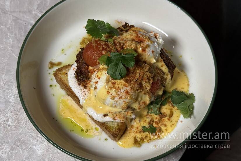 Фірмова бріош, взбитий йогурт, томлена яловичина, томати кімчі, яйця пашот, сирний соус, кінза та цибулевий кранч.