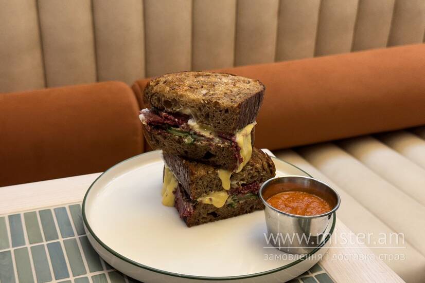 Крафтовий гречаний хліб, соус Айолі, пастрамі з яловичини, мариновані огірки з зеленню, сир Чедер та томатний соус