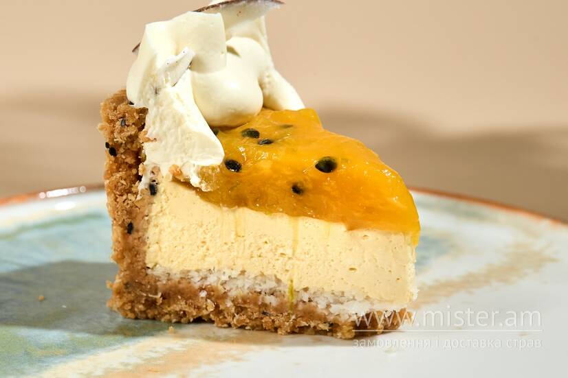 Ніжний манговий чизкейк на основі з пісочного тіста сабле і кокосу з кокосовим дакуазом та прошарком компоте манго маракуйя.