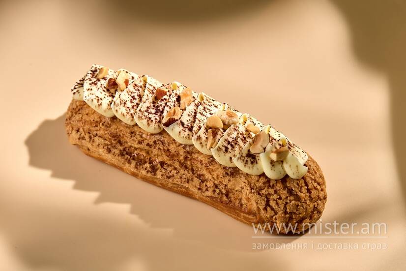 Еклер, заварний крем з фундучною пастою, праліне та шанті з шоколадом.