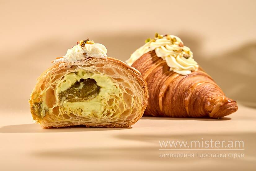 Круасан з холодним фісташковим кремом та фісташковим праліне.