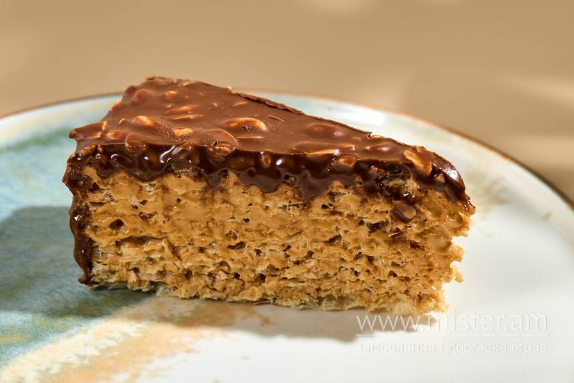 Варіація класичних Андрутів. Вафельні коржі, крем на основі трьох видів молока у молочному шоколаді з горішками.