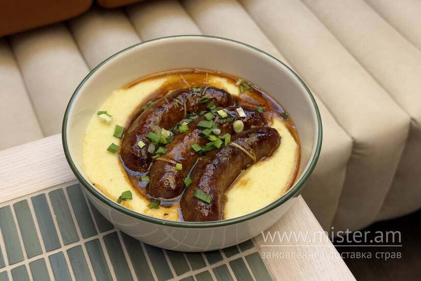 Смажені свино-яловичі ковбаски з картопляно-селеровим пюре.