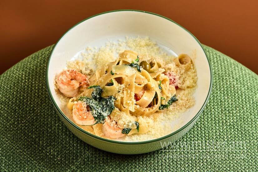Ніжна паста у вершковому соусі з креветками, томатами, оливками, шпинатом та в`яленими томатами — насичено й збалансовано.