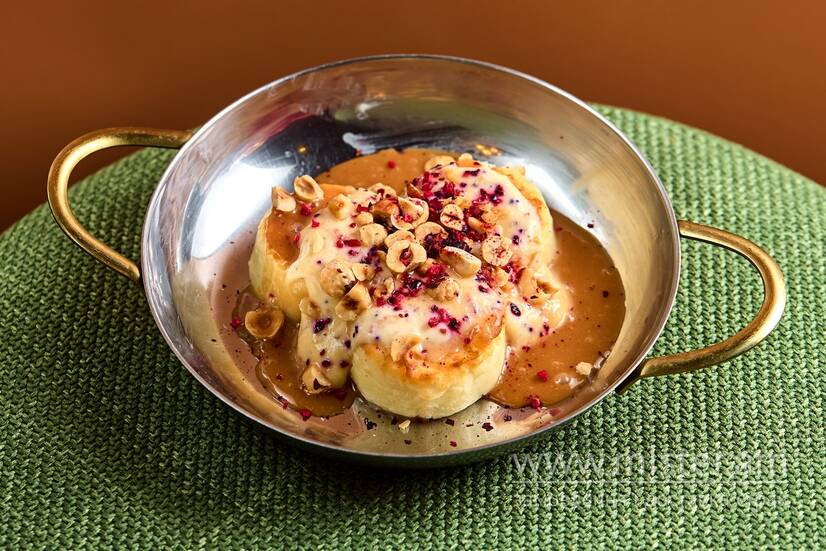 Домашні сирники з ніжною текстурою, подаємо з ароматним заварним кремом,солоною карамеллю та лісовими горішками.