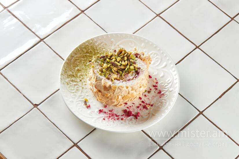 Яєчний білок, лимонна кислота, цукор, мигдалеві пластівці, фісташки, крем-сир, полуниця, малина, журавлина, малина сублімована, зелена матча.