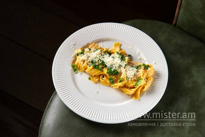 Паста власного виробництва, вершкове масло, курячий бульйон, сир горгонзола, часник, шпинат, пармезан, пангратто.