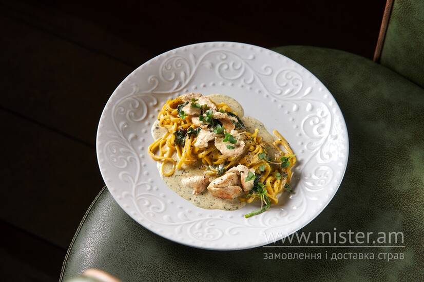 Паста фреска, куряче філе, вершки, трюфельна паста, шпинат, курячий бульйон, пармезан.