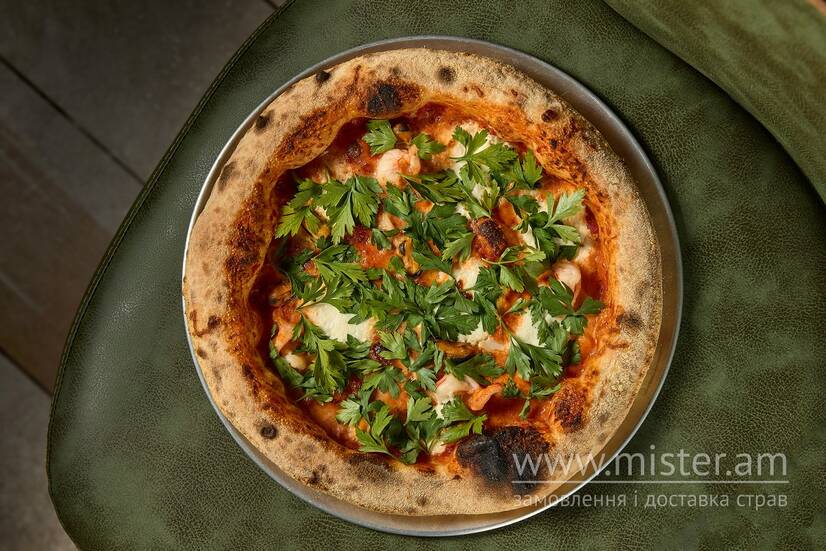 Тісто за фірмовим соусом, томатний соус, кальмари, мідії, креветки, крем фета та петрушка.