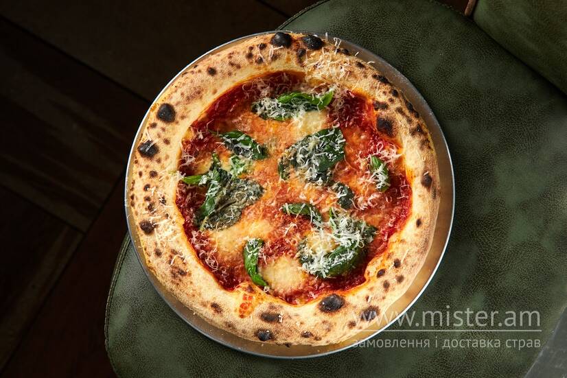 Тісто за фірмовим рецептом, томатний соус, моцарелла буффало, свіжий базилік.