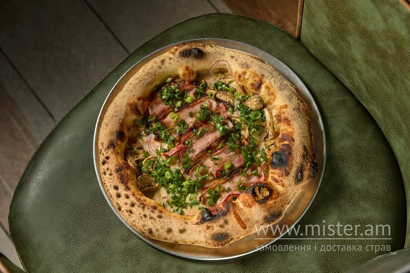 Тісто за фірмовим рецептом, гриби печериці, перцевий соус, панчета, цибуля, зелена цибуля, моцарела.
