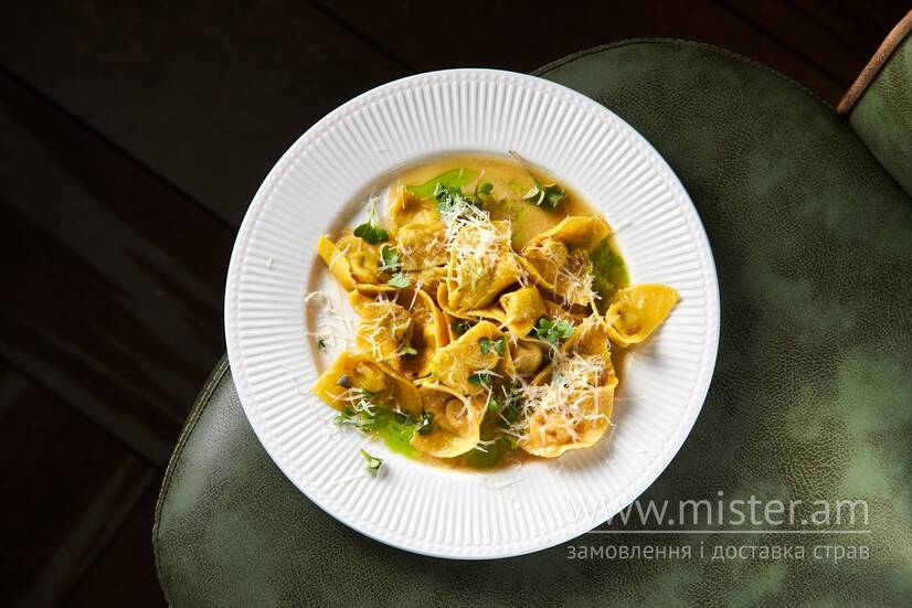 Тісто з твердих сортів борошна, начинка (свино-яловичий фарш, панчета, цибуля, часник, вершки) подаємо з вершковим соусом, чері, та пармезаном.