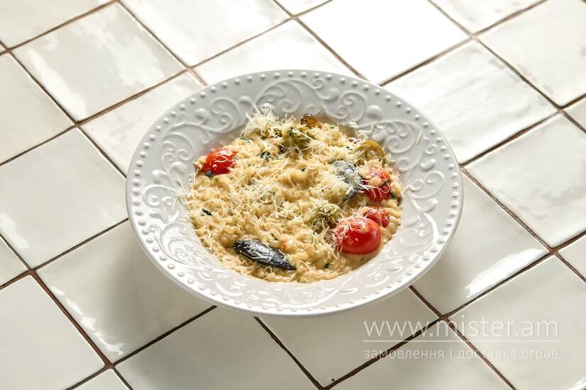Рис арборіо, цибуля ріпчаста, часник, біле вино, курячий бульйон, мікс морепродуктів (кальмар, мідії), чері, оливки, пармезан, вершки, вершкове масло.